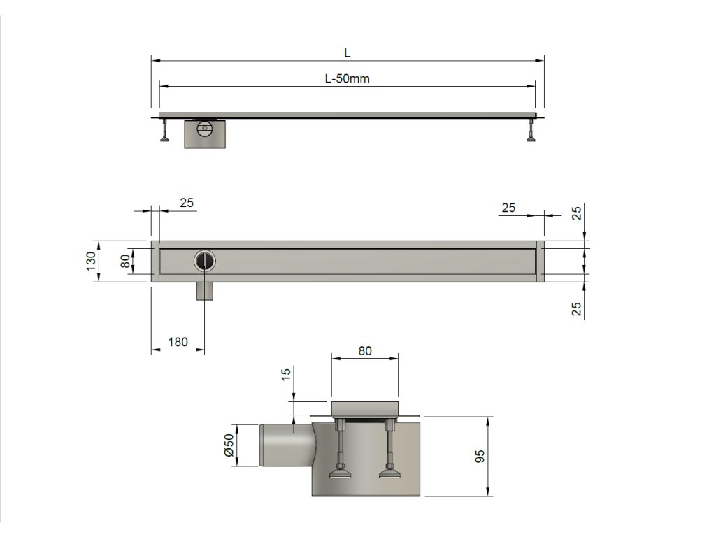 Sprchový nerezový žlab Classic 90 cm – boční odtok, instalace do prostoru